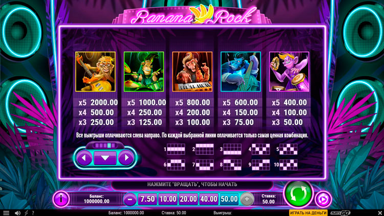 Таблица выплат Banana Rock